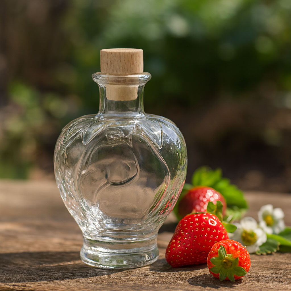 Το μπουκάλι με σχέδιο «Φράουλα» εντυπωσιάζει με τον γοητευτικό, λεπτομερή σχεδιασμό του και φέρνει τη γλύκα και τη φρεσκάδα του αγαπημένου καλοκαιρινού φρούτου σε μια κομψή γυάλινη μορφή. Κατασκευασμένο από υψηλής ποιότητας διάφανο γυαλί, είναι ιδανικό για εκλεκτά αποστάγματα, φρουτώδη μπράντυ ή εκλεπτυσμένα λικέρ. Η αρμονικά δομημένη επιφάνεια θυμίζει την φυσική υφή μιας φράουλας και κάνει το μπουκάλι πραγματικά εντυπωσιακό. Χάρη στο φελλό, το περιεχόμενο μπορεί να κλείσει με ασφάλεια και στυλ.